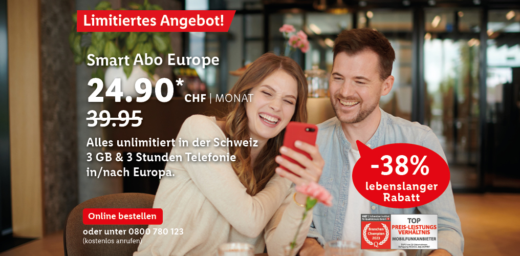 * Monatlicher Preis gültig bei Neuabschluss eines Lidl-Connect-Abos während der gesamten Vertragslaufzeit. Vertrag mit einer Mindestlaufzeit von 1 Monat. Aktivierungskosten inkl. SIM-Karte: 49.-. Angebot gültig bis 04/03/2024.