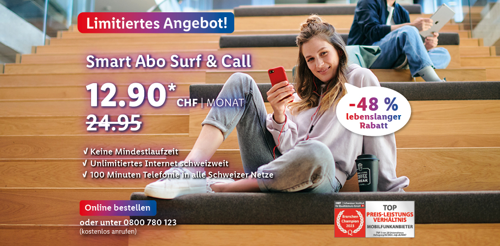 **Monatlicher Preis gültig bei Neuabschluss eines Lidl-Connect-Abos während der gesamten Vertragslaufzeit. Vertrag mit einer Mindestlaufzeit von 1 Monat. Aktivierungskosten inkl. SIM-Karte: 49.-. Angebot gültig bis 26/02/2024.