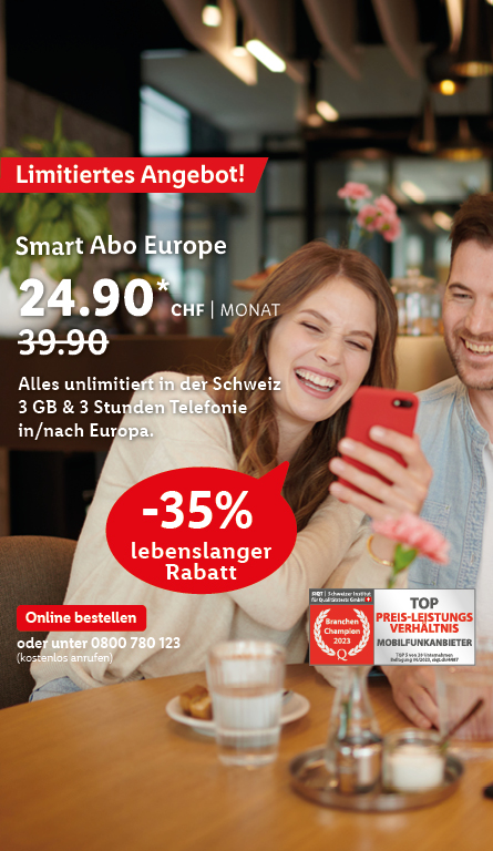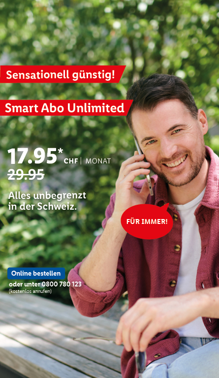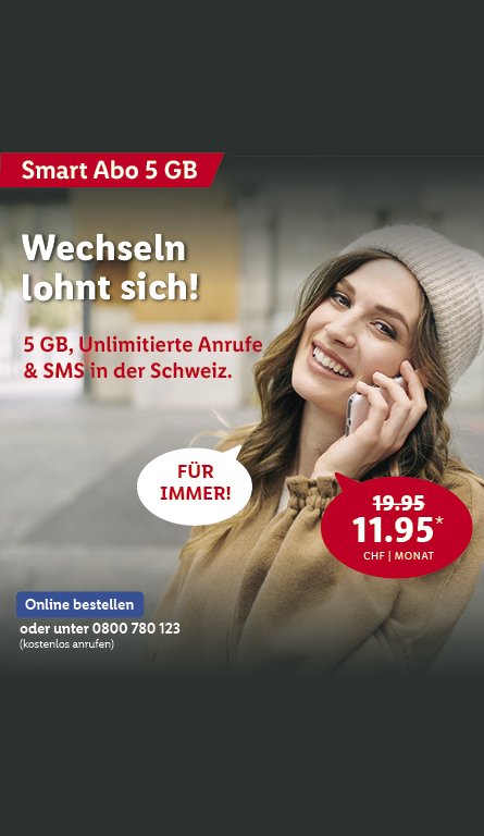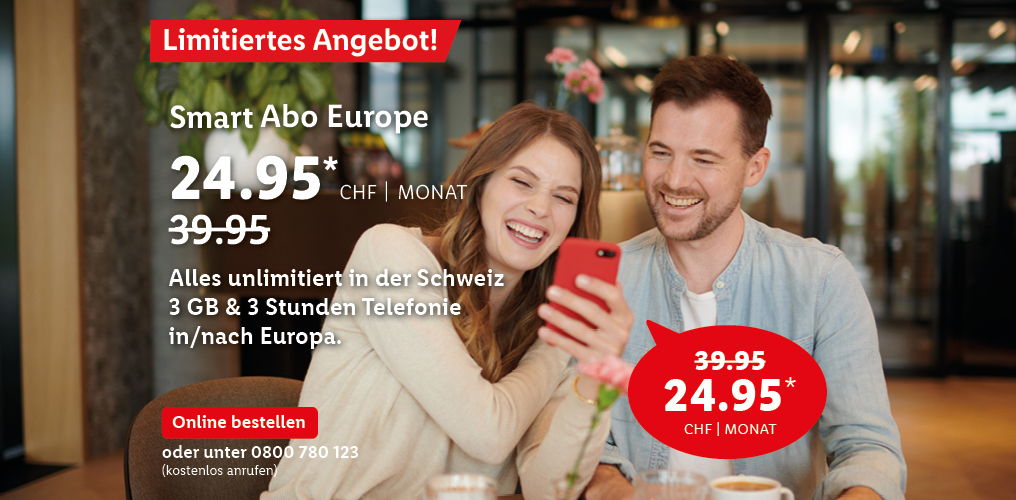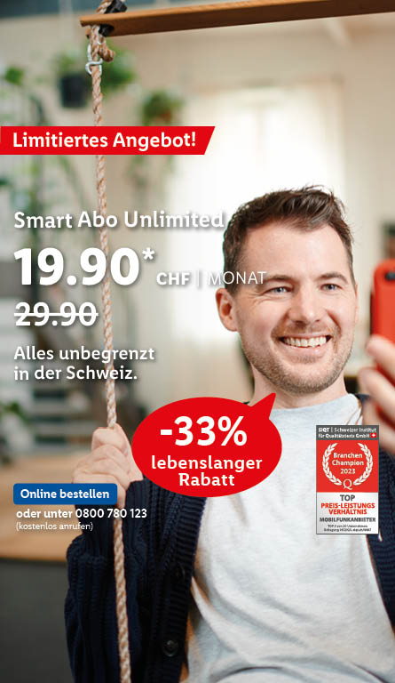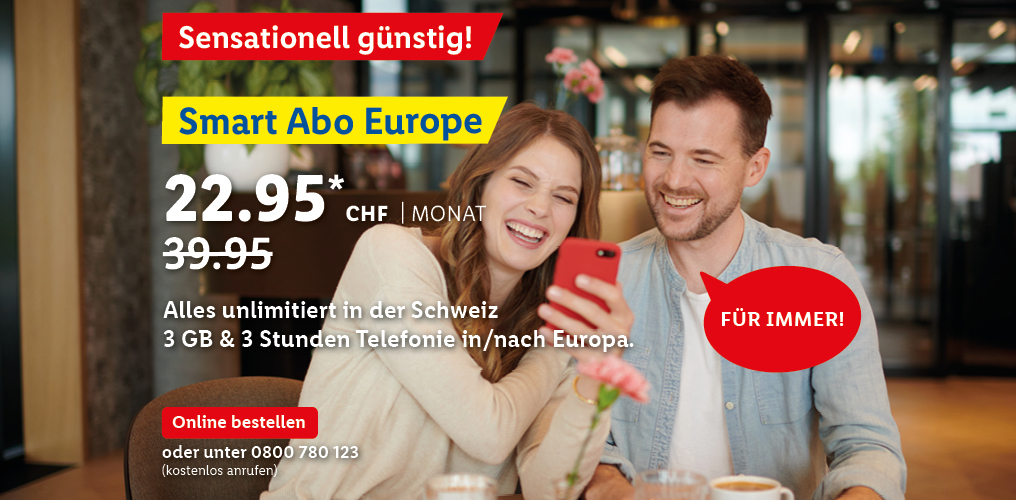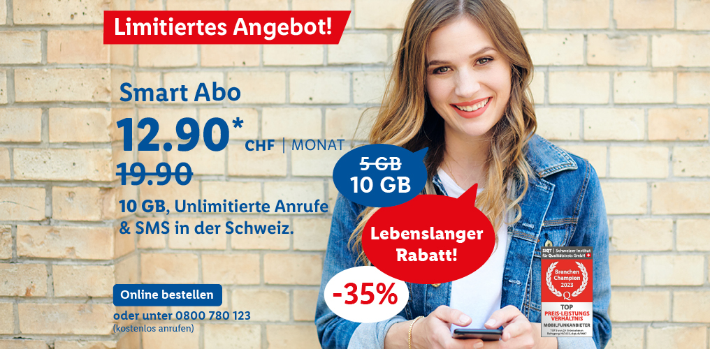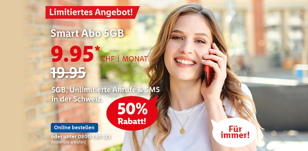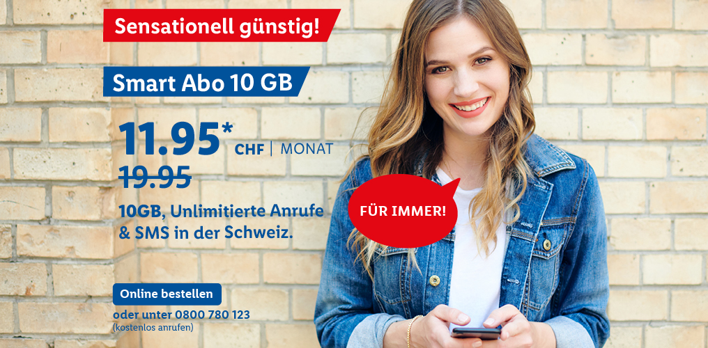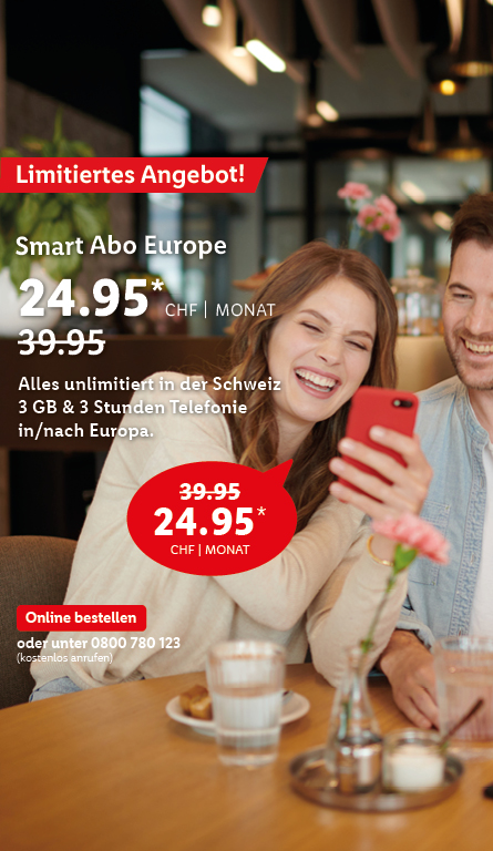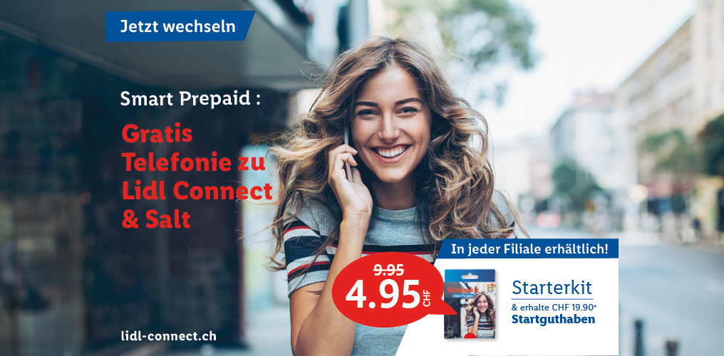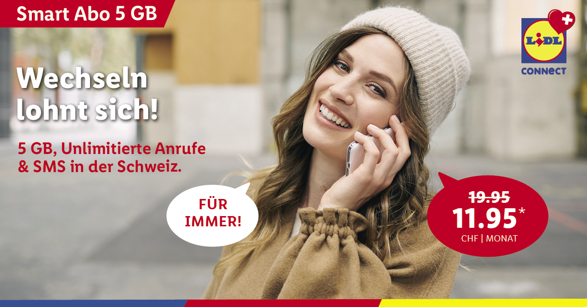 *Monatlicher Preis gültig bei Neuabschluss eines Lidl Connect Abos während der gesamten Vertragslaufzeit. Vertrag mit einer Mindestlaufzeit von 1 Monat. Aktivierungskosten inkl. SIM-Karte: 49.-. Angebot gültig bis 09.10.2023.
