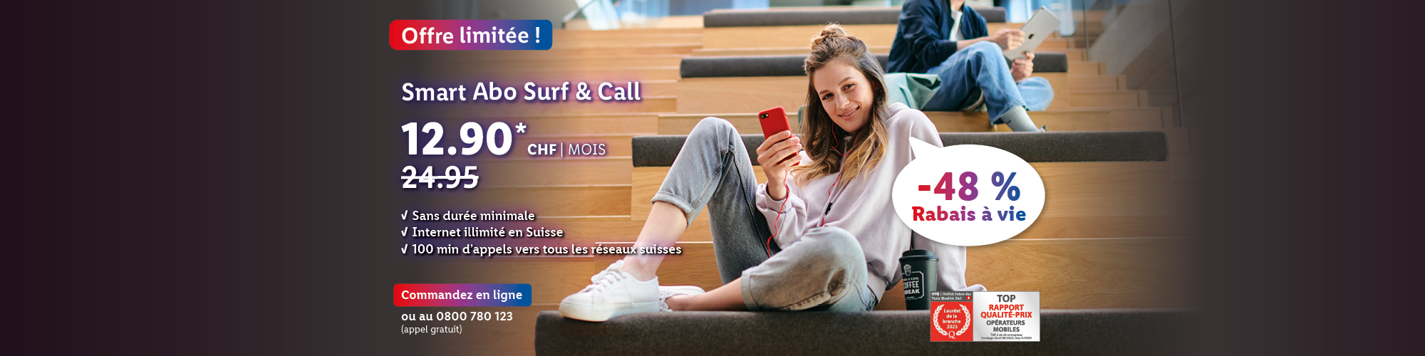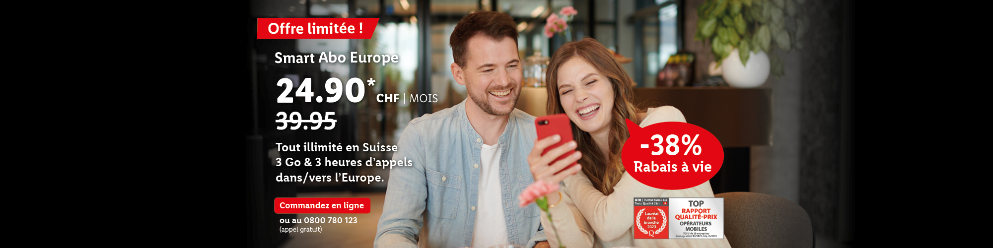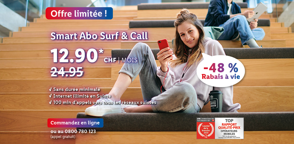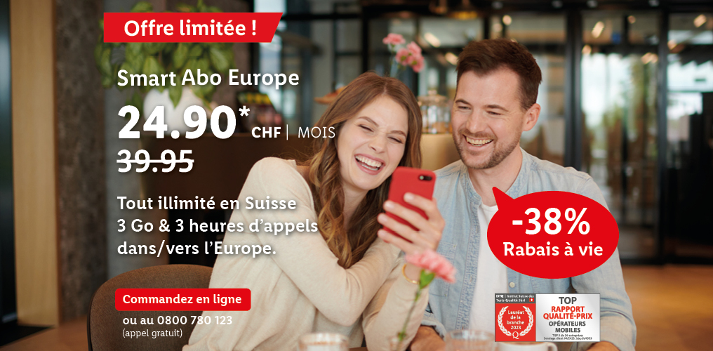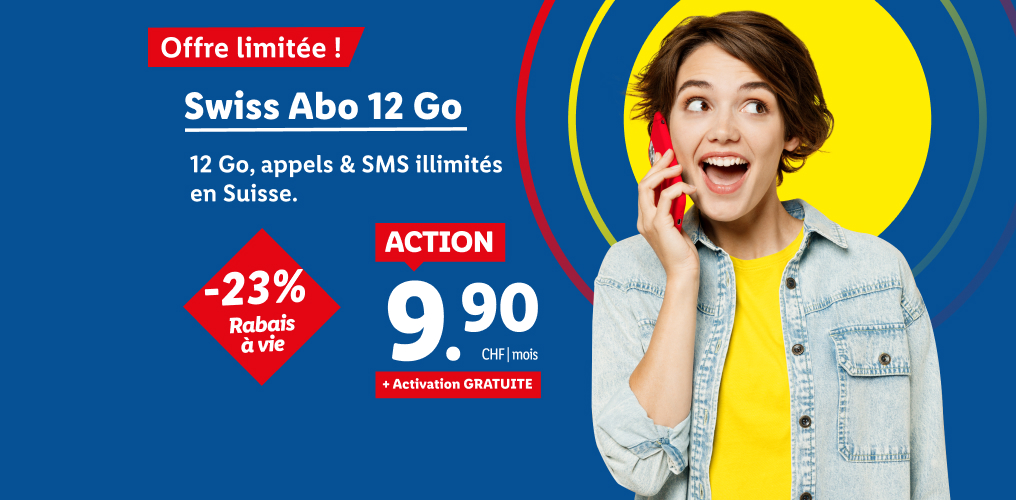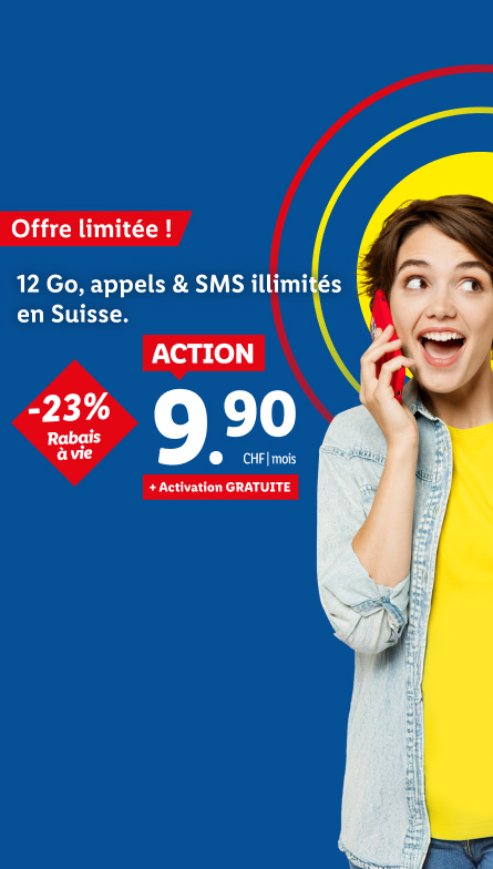 *Prix mensuel valable pour un nouvel abonnement Lidl-Connect pendant toute la durée du contrat. Contrat de 1 mois. Frais d’activation carte SIM incluse : 49.-. Offre valable jusqu’au 04/03/2024.