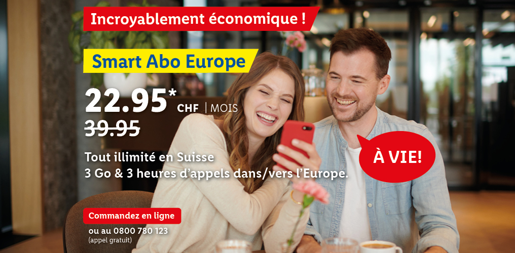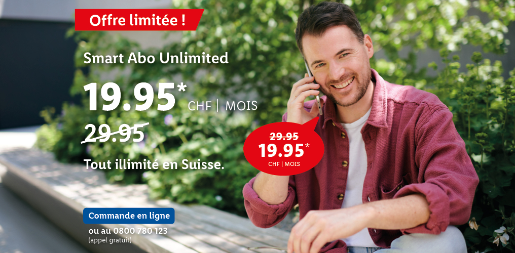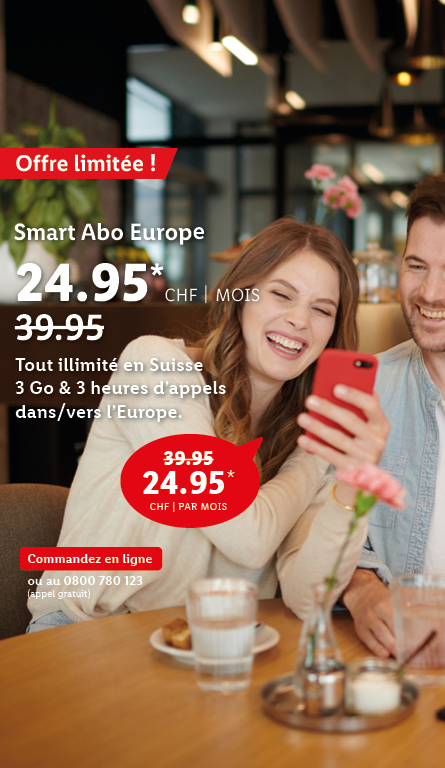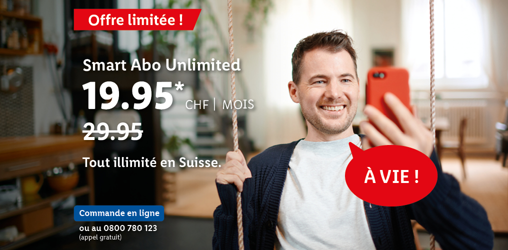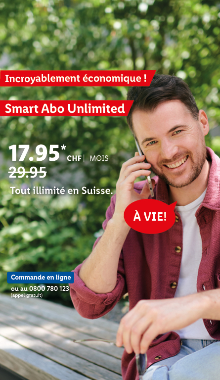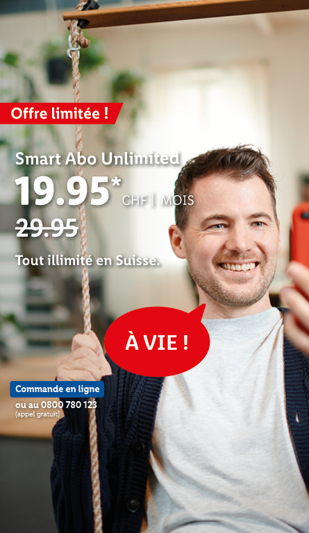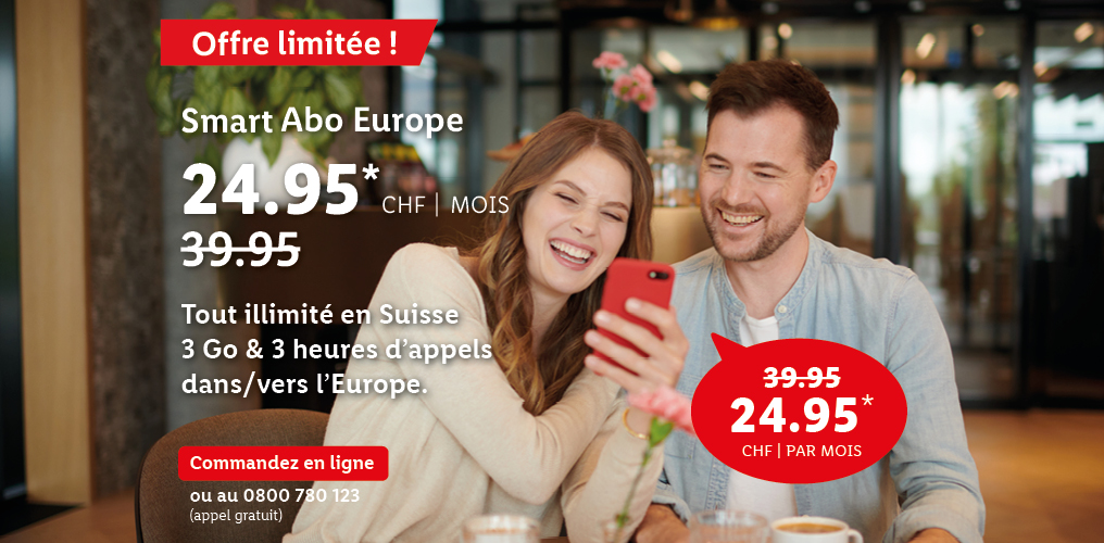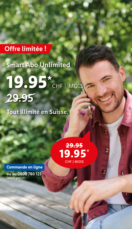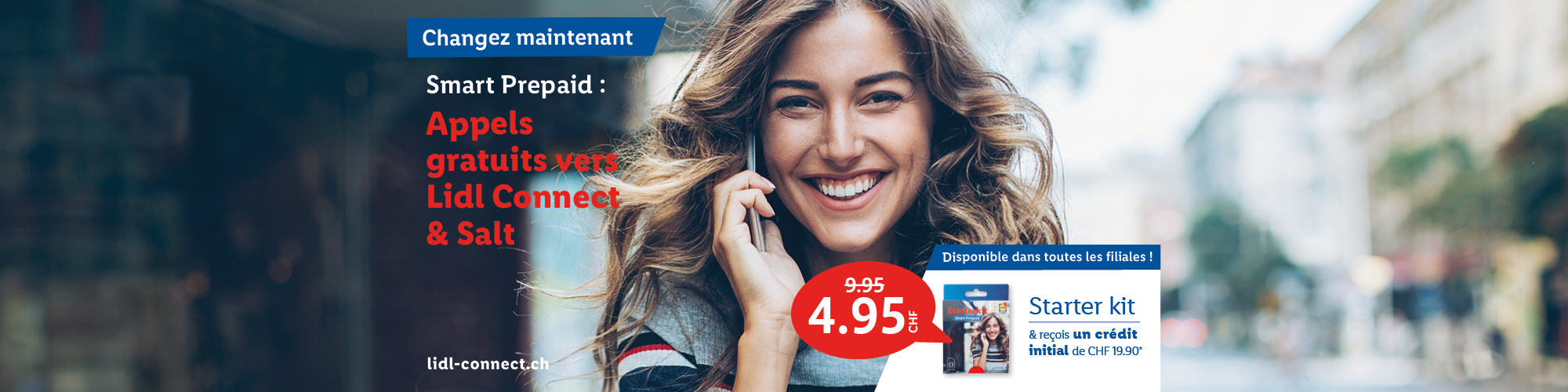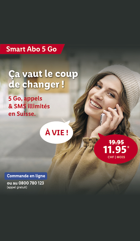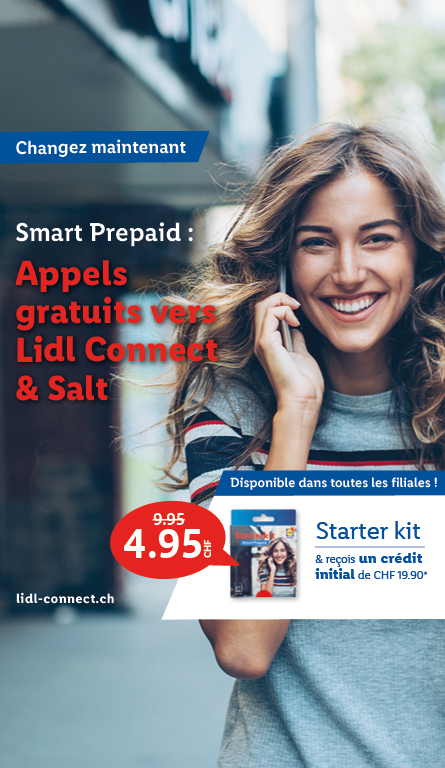 *Prix mensuel valable pour un nouvel abonnement Lidl-Connect pendant toute la durée du contrat. Contrat de 1 mois. Frais d’activation carte SIM incluse : 49.-. Offre valable jusqu’au 23/10/2023.
