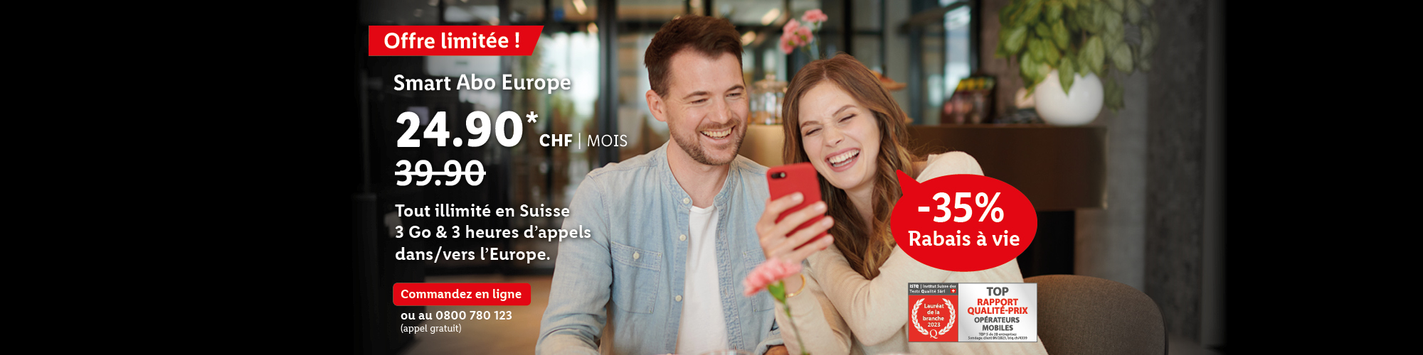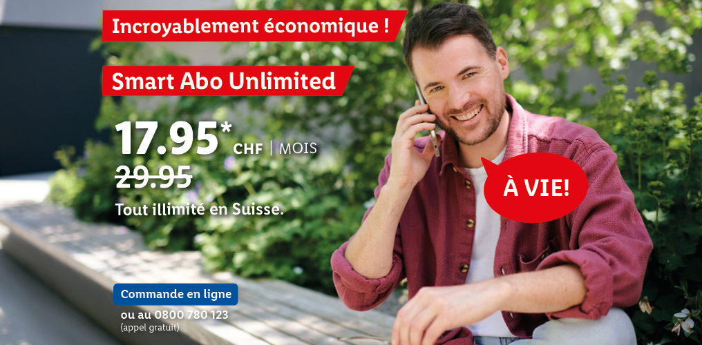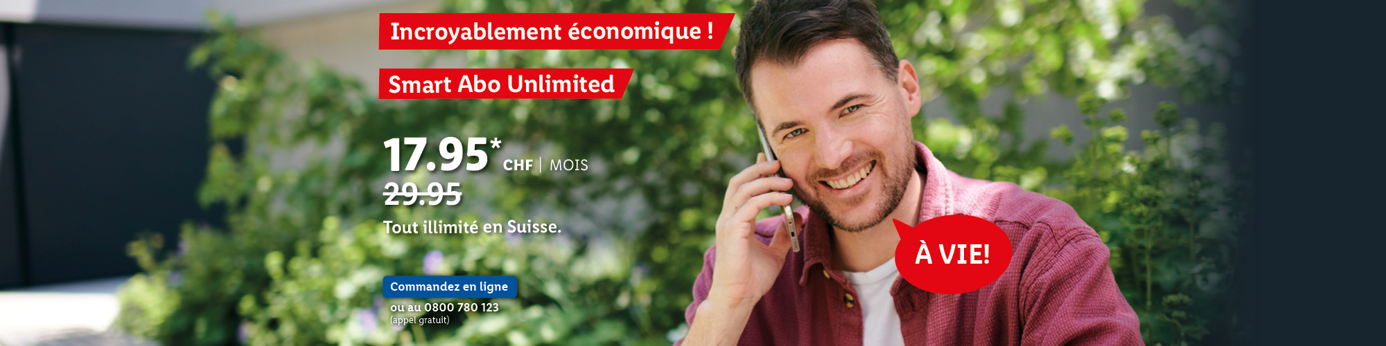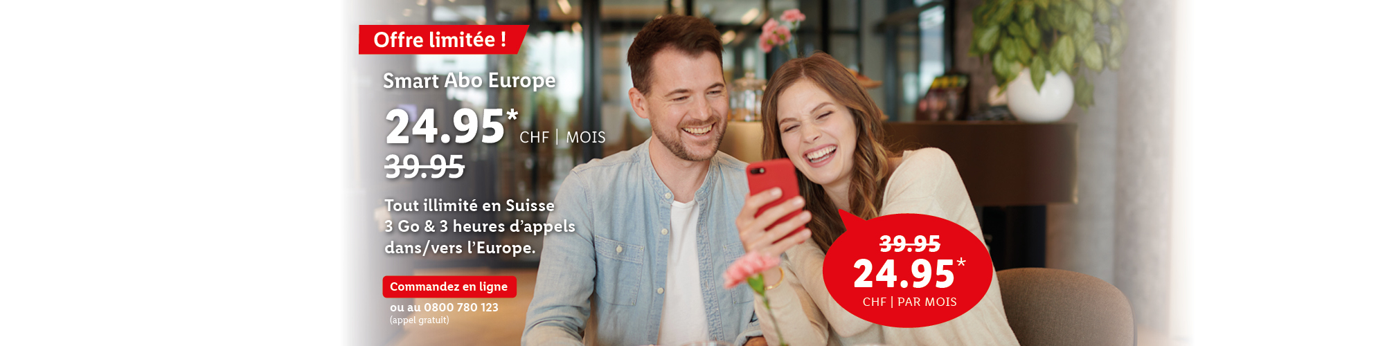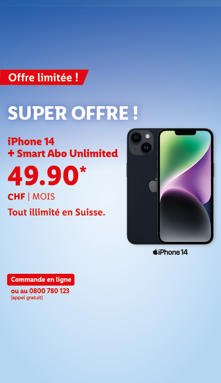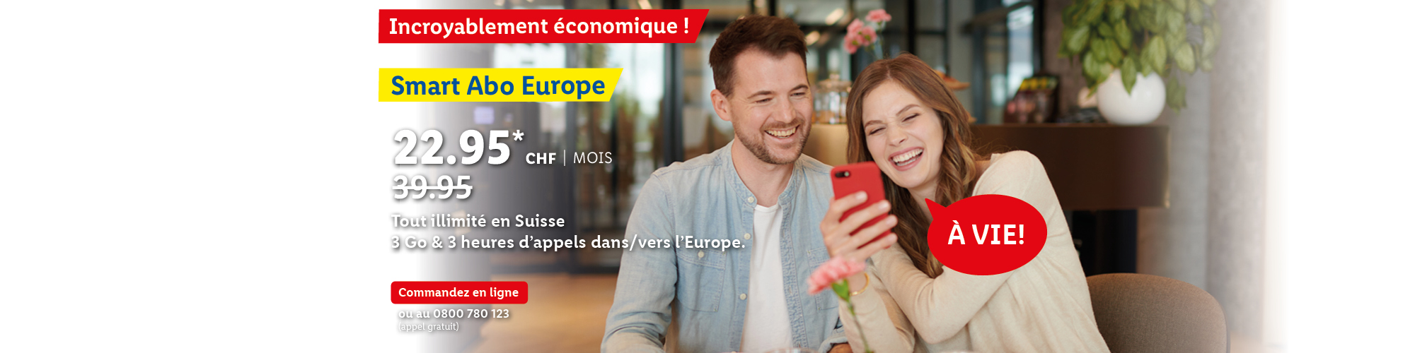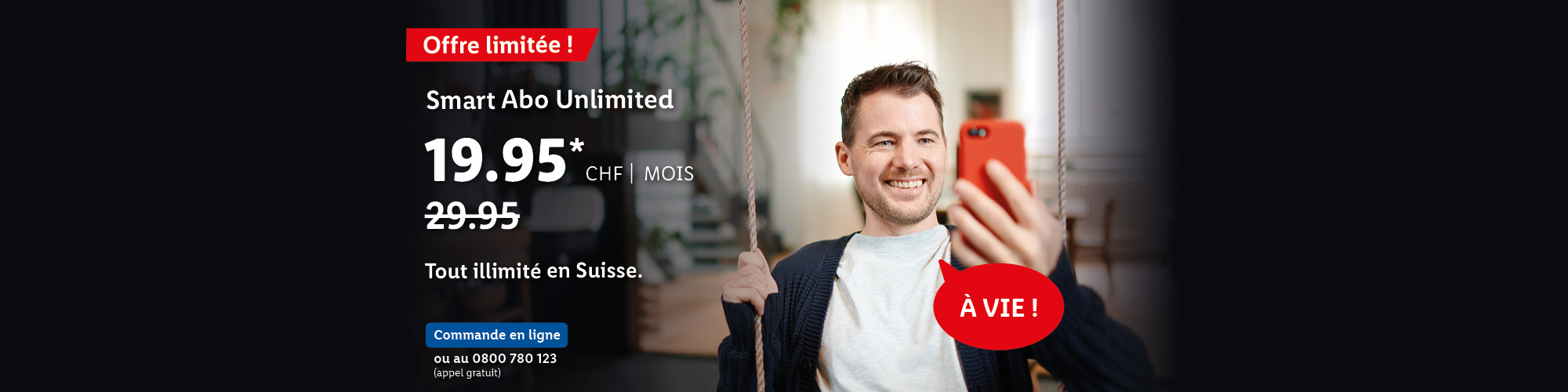 *Prix mensuel valable pour un nouvel abonnement Lidl-Connect pendant toute la durée du contrat. Contrat de 1 mois. Frais d’activation carte SIM incluse : 49.-. Offre valable jusqu’au 23/10/2023.