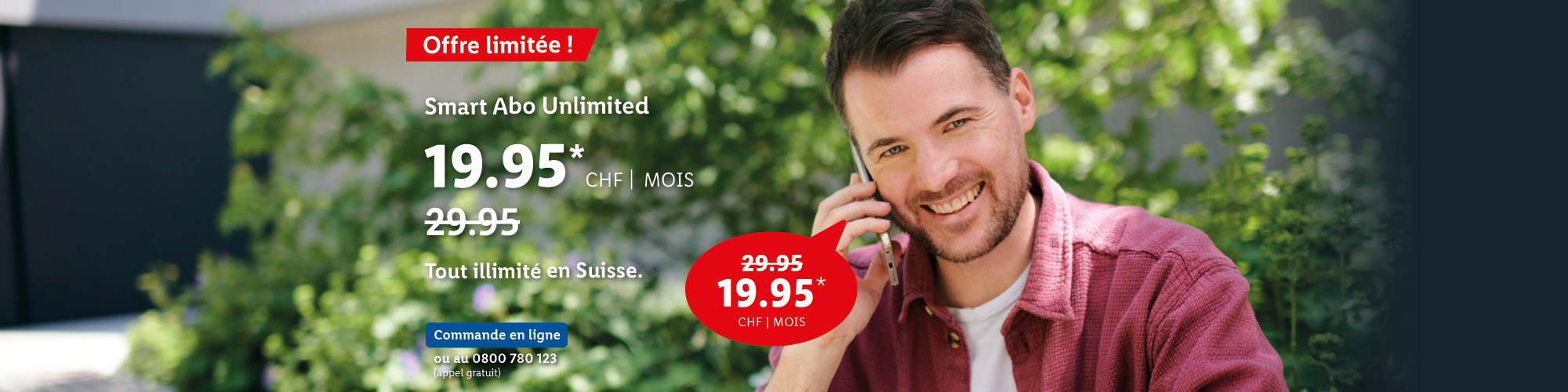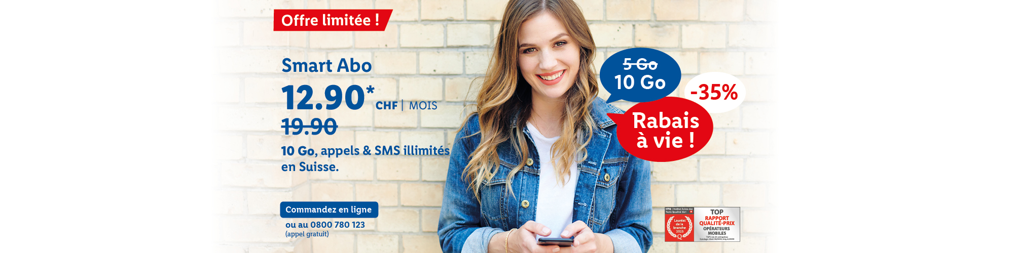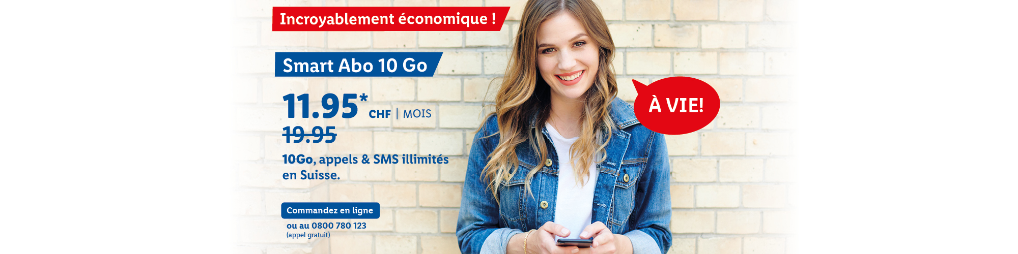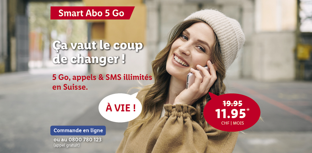 * Prix mensuel valable pour un nouvel abonnement Lidl-Connect pendant toute la durée du contrat. Contrat de 1 mois. Frais d’activation carte SIM incluse : 49.-. Offre valable jusqu’au 09/10/2023.