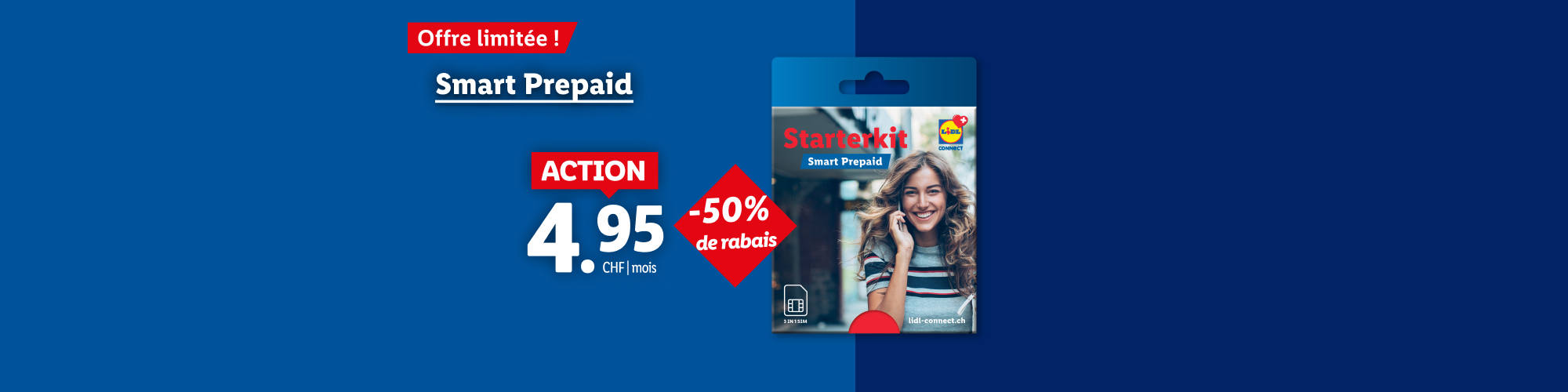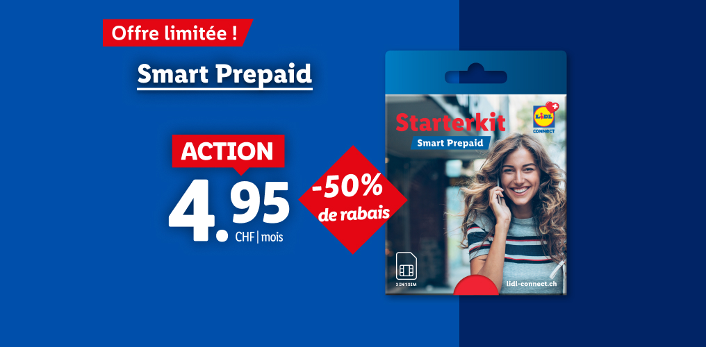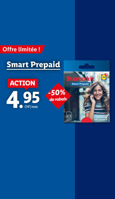 *Offre valable pour toute activation d’une carte SIM Smart Prepaid au prix de 4.95 CHF au lieu de 9.95 CHF. Le crédit initial est de 19.90 CHF au lieu de 9.95 CHF pendant la période promotionnelle. Offre valable jusqu'au 31.12.2025. Sous réserve d'une éventuelle prolongation.