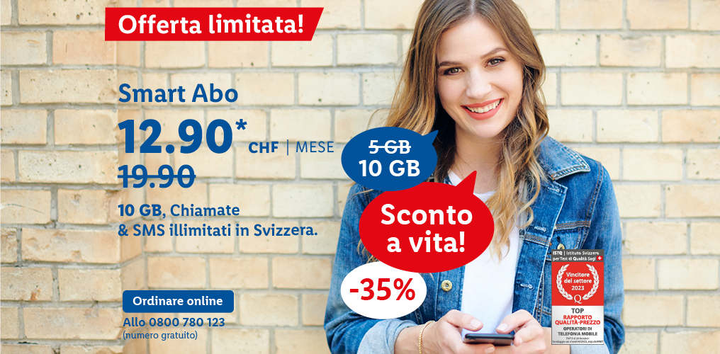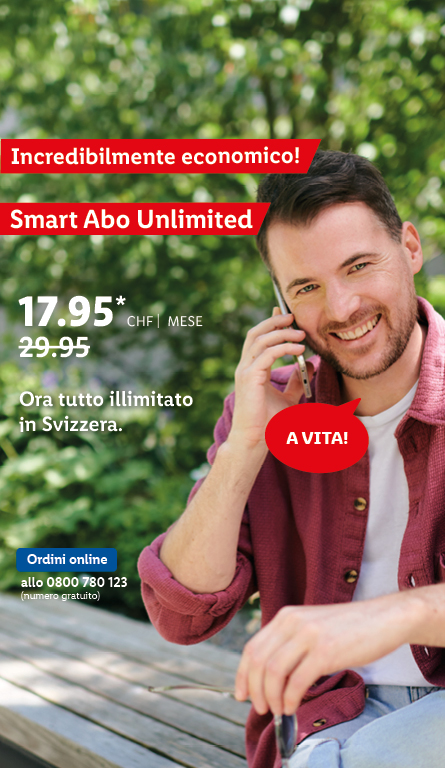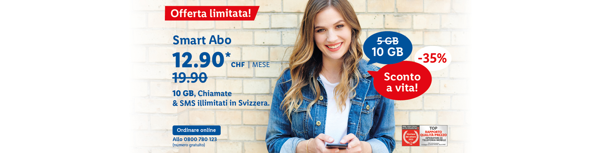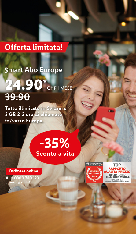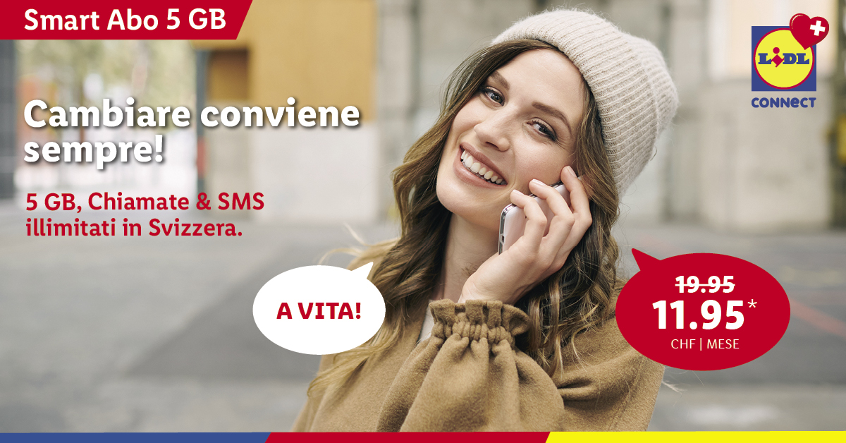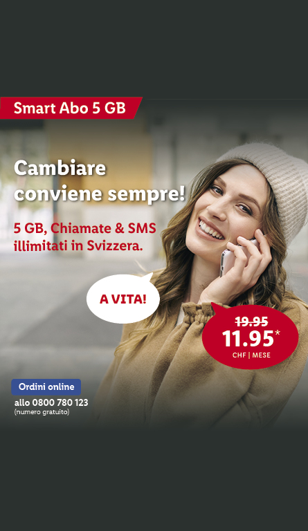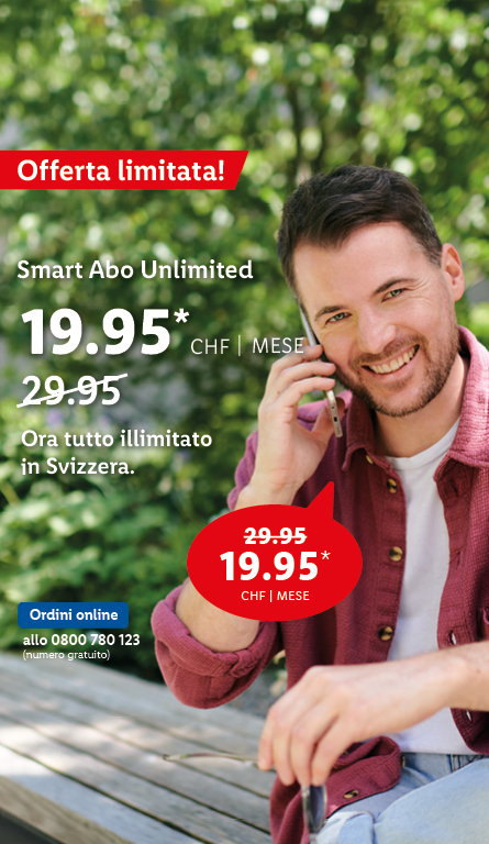 **Prezzo mensile alla stipula di un nuovo abbonamento Lidl Connect. Sconto valido per tutta la durata del contratto. Contratto di 24 mesi, rescindibile con un preavviso di 60 giorni. Costi di attivazione con scheda SIM inclusa: 49.-. Offerta valida fino al 23.10.2023.