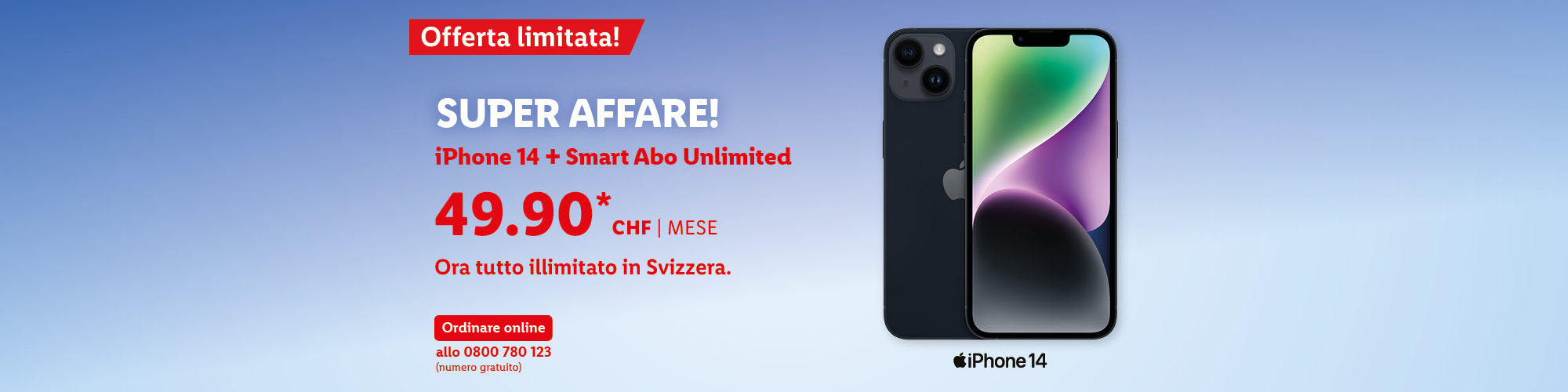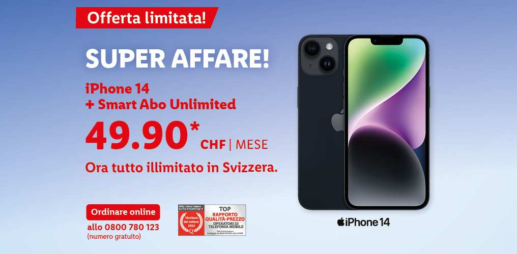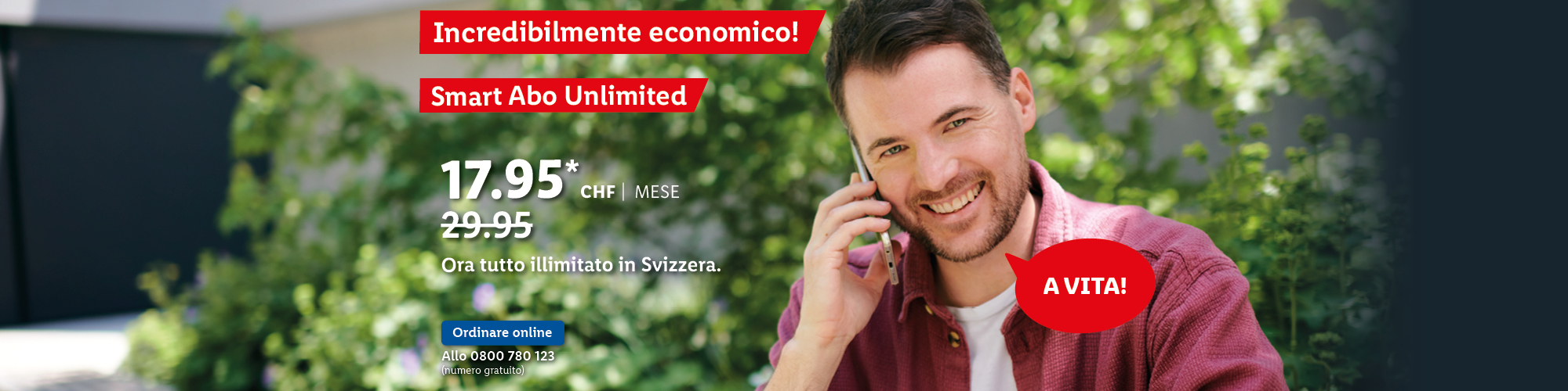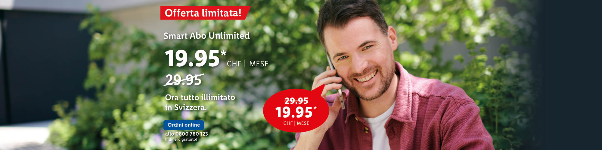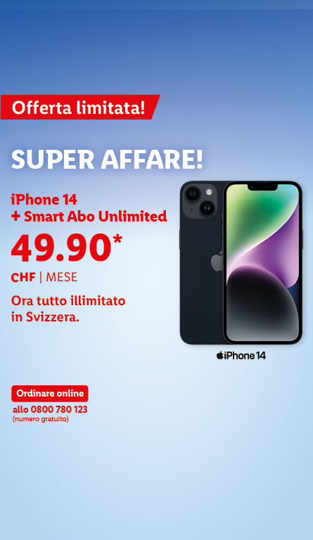 **Prezzo mensile alla stipula di un nuovo abbonamento Lidl Connect. Sconto valido per tutta la durata del contratto. Contratto di 24 mesi, rescindibile con un preavviso di 60 giorni. Costi di attivazione con scheda SIM inclusa: 49.-. Offerta valida fino al 23.10.2023.