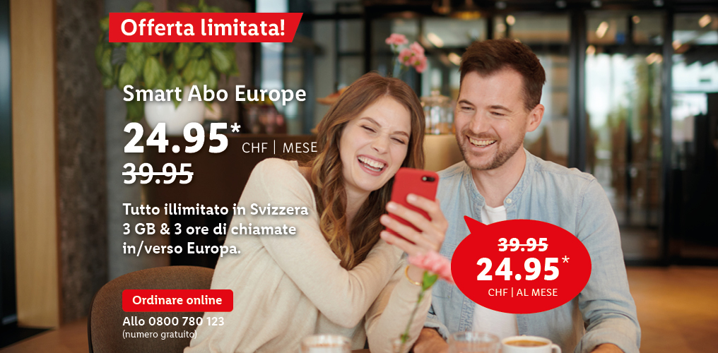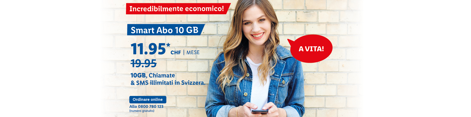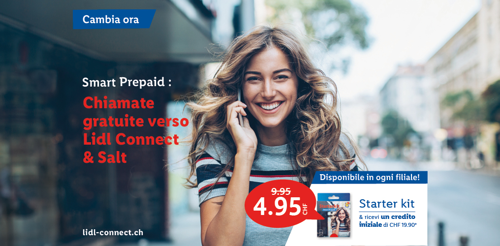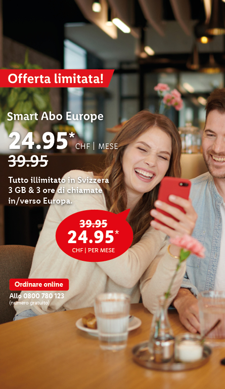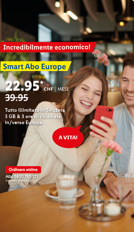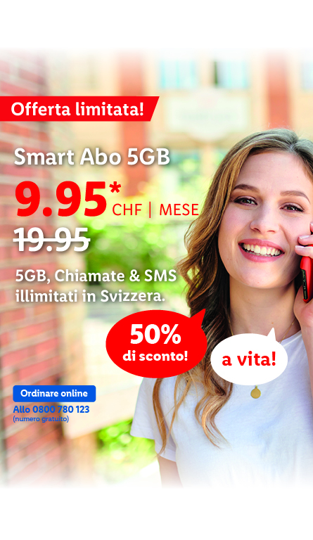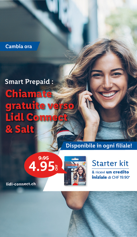 *Prezzo mensile valido per un nuovo abbonamento Lidl Connect durante l’intera durata del contratto. Contratto di 1 mese. Costi di attivazione con carta SIM inclusa: 49.-. Offerta valida fino al 09.10.2023.