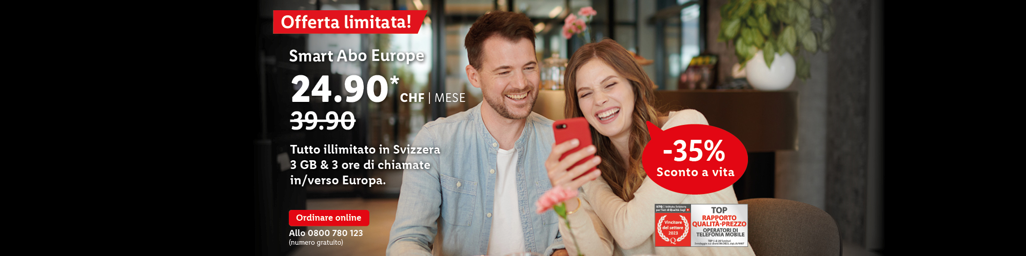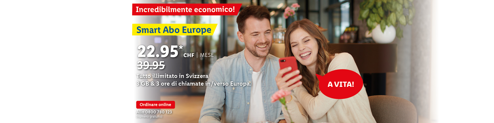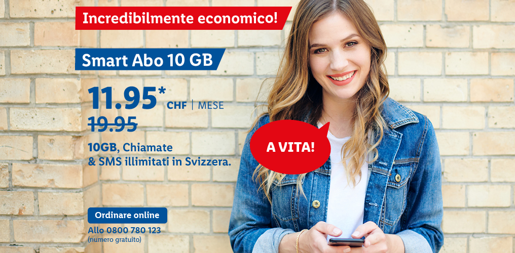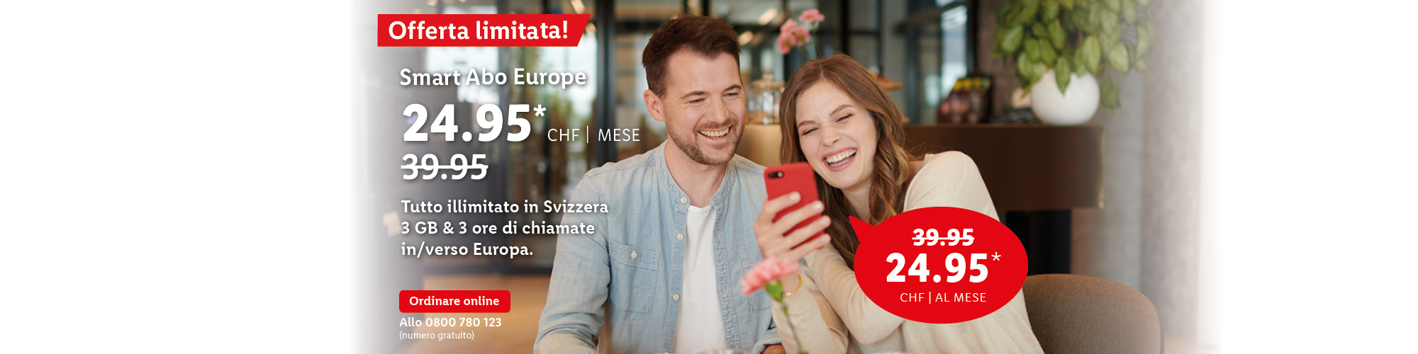 *Prezzo mensile valido per un nuovo abbonamento Lidl Connect durante l’intera durata del contratto. Contratto di 1 mese. Costi di attivazione con carta SIM inclusa: 49.-. Offerta valida fino al 09.10.2023.